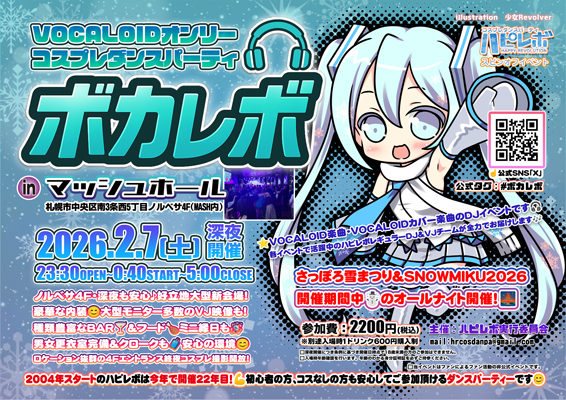 SNOWMIKU2026やさっぽろ雪まつりも開催中の、2月7日土曜日オールナイトの絶好の日程で、ボーカロイド人気楽曲や関連楽曲、ボカロカバー楽曲で、ステージで踊ったりフロアで盛り上がって楽しんだりと最高のひとときをお届けします🎵