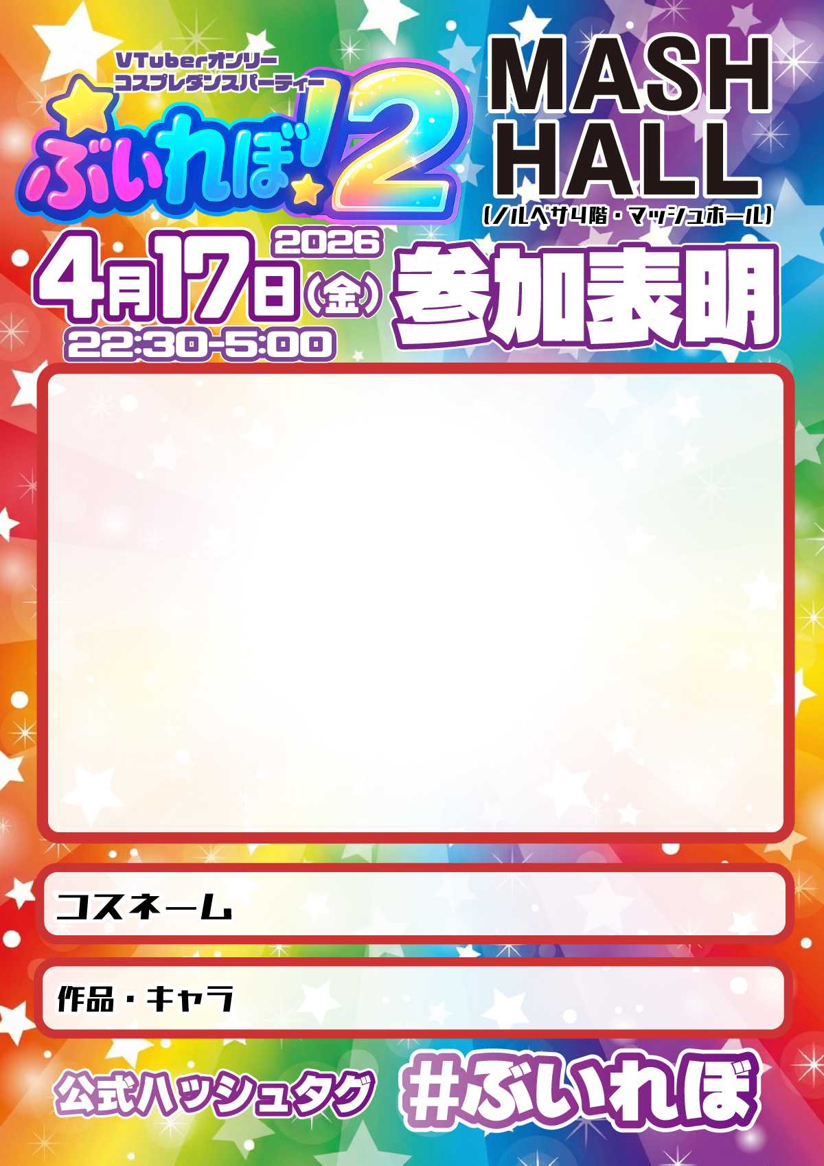 • 「ぶいれぼ! in マッシュホール」はコスプレ及びダンスやパフォーマンスを通じた交流の場を目的として、コスプレをするしないに関わらず、男女性別問わずどなたでもご参加頂けるイベントではありますが、女性の方も安心してご参加頂ける安全で快適なイベント開催のため、主催者の判断で当イベントの趣旨・雰囲気にそぐわない方のご入場をお断りする場合がございます。またご入場後でもセキュリティスタッフによりお声かけさせて頂く場合がございます。予めご了承下さい。(振り付けなどの縛りなどはなくご自由にお楽しみ頂けますが、家虎やヲタ芸を打つイベントではなく「踊ってみた曲、パフォ曲多めの【ダンスパーティー】」となりますので、恐縮でございますが趣旨のご理解に何卒ご協力の程よろしくお願いいたします。(女性の方に安心してご参加頂ける環境に配慮した、踊ってみた、振り付け曲が多めの「ダンスパーティー」となります)